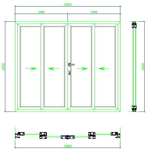 Loại cửa này phù hợp với những không gian mặt tiền hẹp. Độ mở của cửa là từ 1/3 - 1/2, với hệ bánh xe lăn kết hợp với ray trượt, cùng với hệ gioăng kín khít cửa mở rất nhẹ và êm.